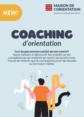 Les séances individuelles sont proposées aux jeunes jusqu'à 22 ans inclus et sont disponibles en luxembourgeois, français, allemand et anglais. Prends ton rendez-vous via MyGuichet.lu et choisis entre une séance individuelle en ligne ou à la Maison de l'orientation !